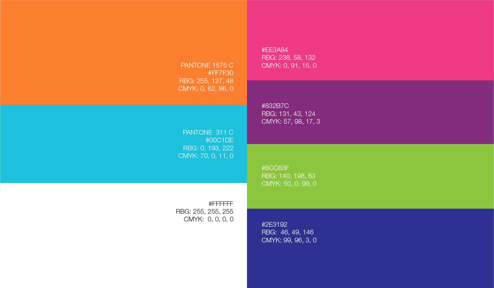 Magenta pink, purple, lime green, and navy blue serve as industry-specific color coding, enabling instant product differentiation while maintaining a cohesive brand system.