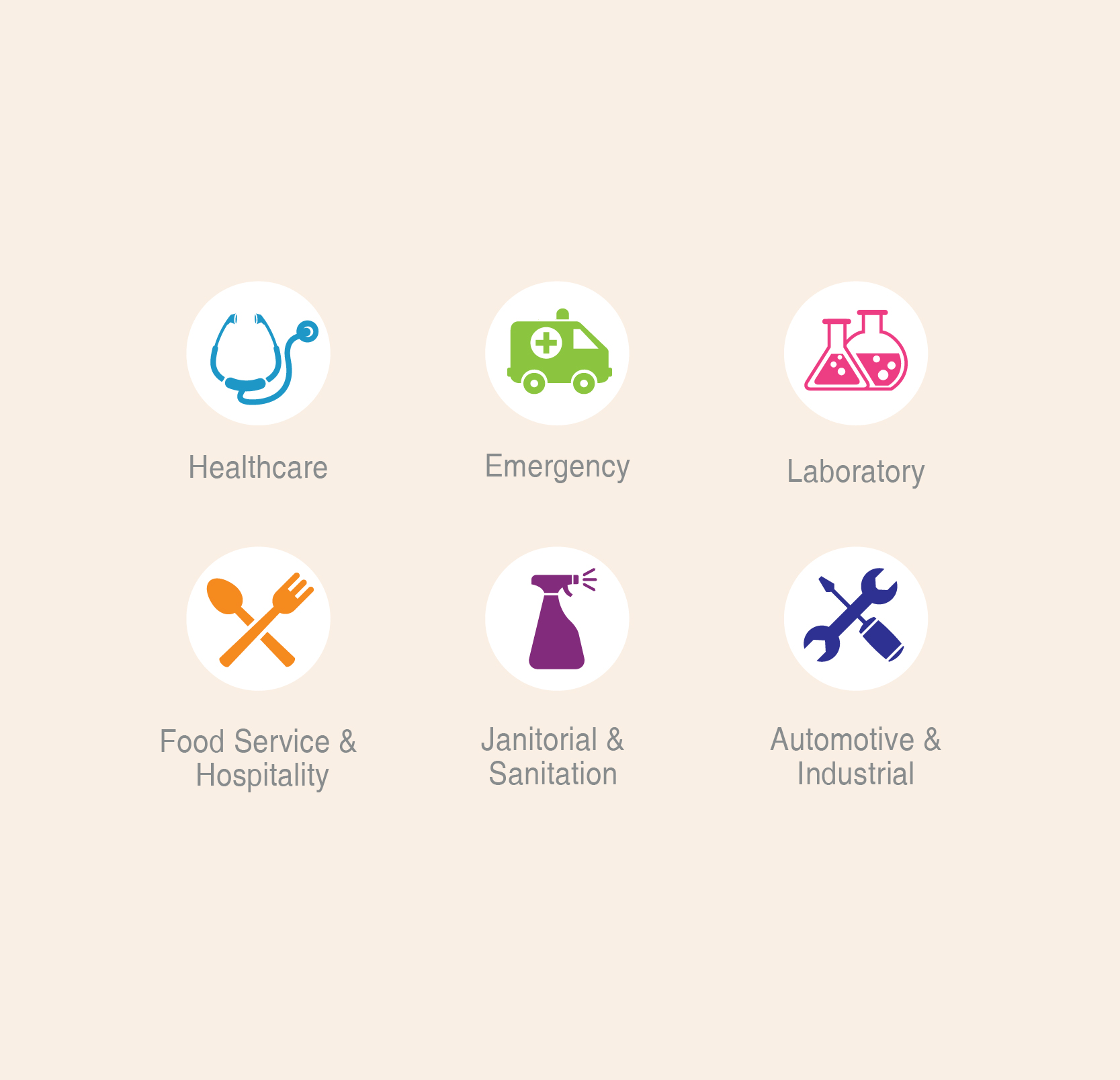 Redesigned the industry icon library for six markets (Healthcare, Emergency, Laboratory, Food Service, Janitorial, Automotive and Industrial). Each market uses distinct color coding for fast navigation while retaining a consistent circular icon structure.